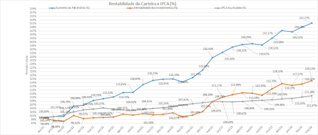 Nos gráficos abaixo seguem os dados costumeiros de crescimento da carteira, sua lucratividade sem aportes e IPCA acumulado para dois períodos diferentes: O primeiro desde o inicio do meu monitoramento (dezembro/21) e o segundo do acumulado de 2024. Lembrando que para o mês de março como ainda não temos o valor final da inflação divulgada, uso o IPCA 15 como referência.